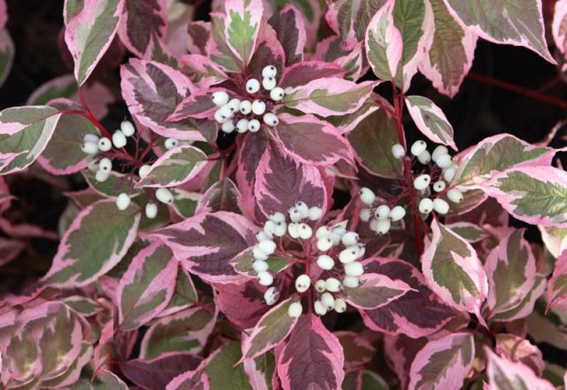 - Im Herbst bekommen die Blätter des Sibirischen Hirsches Variegat einen rosa-lila Farbton. Derain weiß Elegantissima ändert seine Farbe nicht.