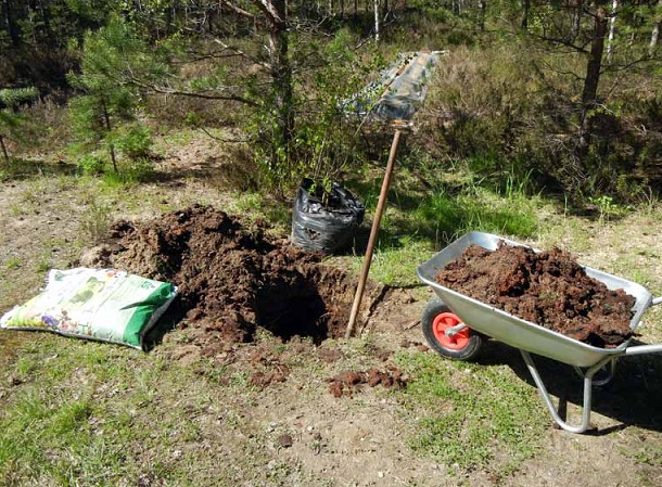 - Die Stelle wird 15 Tage vor dem Pflanzen vorbereitet. Dazu wird der ausgewählte Ort ausgegraben und Mineraldünger, Kompost und Humus in den Boden eingebracht. Mit dieser Vorbereitung des Standortes können die Büsche anschließend mehrere Jahre lang nicht gefüttert werden.