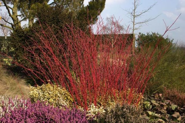 Die Dekorativität des Rasens wird durch Ändern der Farbe erhöht. Im Herbst, nach dem Fall der Blätter, sind die Triebe blutrot gefärbt. Die Sorte blüht nicht, dies wird jedoch nicht als Nachteil angesehen, da die Pflanze auch ohne Blütenstände nicht weniger attraktiv wird.
