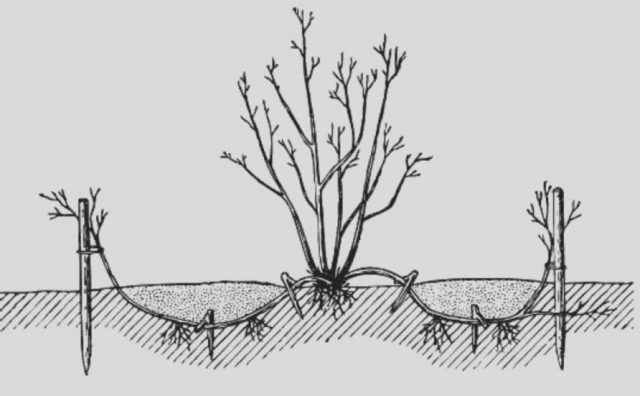Junge Seitentriebe sind für diese Methode geeignet. Der Vorgang wird im Frühjahr durchgeführt, nachdem der Schnee geschmolzen ist. Ein gesunder Trieb wird in einen vorbereiteten Graben gelegt, mit einer Metallklammer am Boden befestigt und bestreut, wobei die Oberseite auf der Oberfläche verbleibt. Der Boden wird mit Sägemehl, Stroh oder Laub gemulcht.