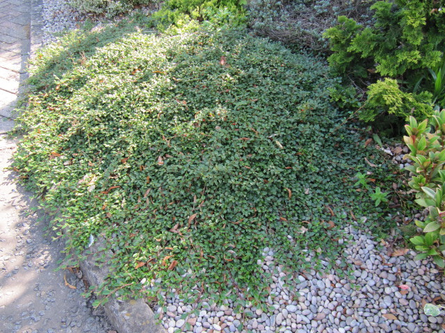 Die Strauchblätter sind klein - bis zu 1,5 cm Durchmesser. Die Oberfläche ist glatt und glänzend. Im Herbst verfärbt sich das Laub des Strauchs rot oder purpurrot.