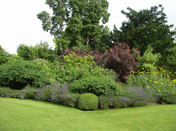 Bei Gruppenpflanzungen passt der Hartriegelstrauch gut zu verschiedenen Nadelbäumen.