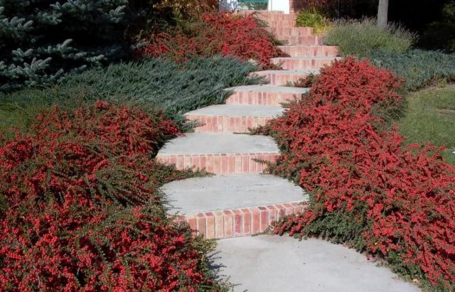 In der Gartenarbeit wird die horizontale Zwergmispel als Zierpflanze sehr geschätzt. Die horizontale Zwergmispel in der Landschaftsgestaltung ist auf verschiedenen Fotos zu sehen. Dies sind meist Hecken und verschiedene Strukturen. Und Sie können auch oft kleine Sorten in Form von Bordsteinstrukturen verwenden, die Gartenwege schmücken.