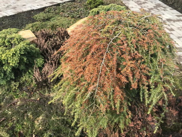 Bei Zypressen, Kiefern und Thujas bleiben die Nadeln 3-8 Jahre am Baum, dann werden sie gelb und fallen auf natürliche Weise ab. Dies macht sich insbesondere in den Tiefen der Krone bemerkbar. Solche Rückstände müssen von Hand gereinigt oder mit einem Wasserstrahl aus einem Schlauch abgewaschen werden.