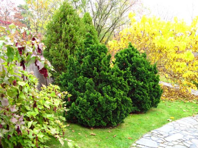 Die Pflege umfasst das Lösen des Bodens nach dem wöchentlichen Gießen. Achten Sie darauf, eine stumpfblättrige Pflanze zu bestreuen, wenn es längere Zeit nicht regnet. Für den Sämling kaufen sie eine spezielle Fütterung für Nadelbäume. Sackleinen, ein Unterschlupf aus Agrofasern, sind für den Winter vorbereitet oder mit Schnee bedeckt. Im nächsten Frühjahr wird beschnitten, beschädigte Äste entfernt und eine Krone gebildet.Der mattblättrige Look verträgt einen Haarschnitt gut, Experten kreieren Topiary-Formen.