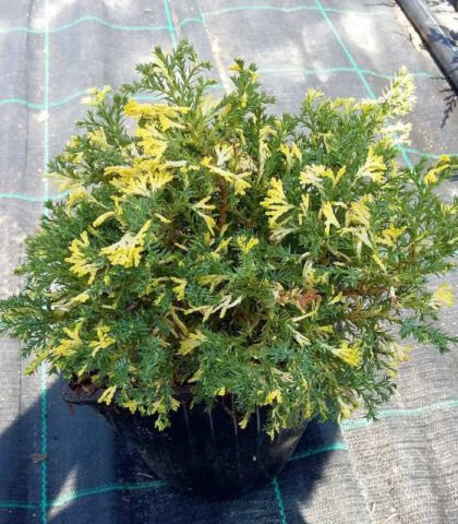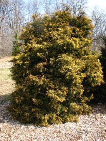 Die durchbrochene konische Krone eines allgemeinen dunkelgrünen Farbtons ist mit gelben Spitzen einzelner Triebe verziert. Die bunte Farbe bleibt das ganze Jahr über erhalten. Das stumpfe Zypressen-Safranspray wächst langsam: Mit 20 Jahren erreicht es 150 cm.