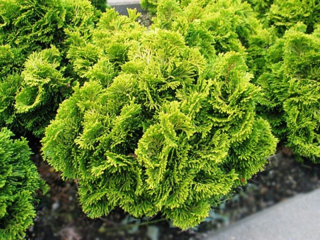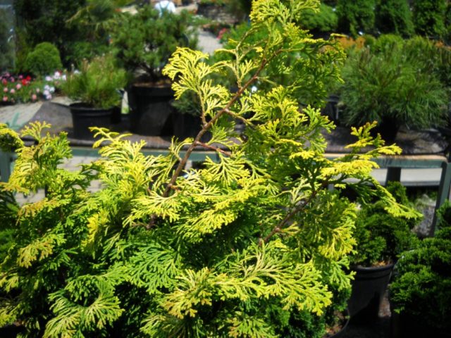 Diese Sorte ist dank ihrer hellgrünen Nadeln auf breiten Fächerblättern dekorativ. Die Krone einer erwachsenen stumpfen Zypresse Pygmaea Aurescens ist ordentlich, abgerundet, hat einen Durchmesser von 2-3 m und ist im Verhältnis zum Stamm, der 1,5 bis 2 m groß wird, niedrig. Pygmäen-Aurescens verträgt städtische Rauchbedingungen gut.