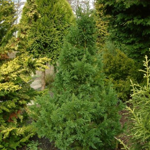 Kultur sieht in jeder Umgebung harmonisch aus. Stumpfe Zypressen bilden einen Kontrast zu blühenden Pflanzen in der warmen Jahreszeit und beleben im Winter die monochromatische Landschaft. Die für unsere Gärten geeigneten Pflanzenformen sind vielfältig: schlanke Pyramidenbäume, Sträucher mit ursprünglicher Blattfarbe, Elfenbäume.