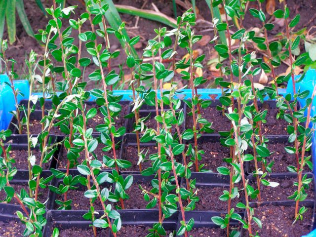 Die Vermehrung durch Stecklinge ist ein einfacher und zuverlässiger Weg, um Cotoneaster-Sämlinge zu erhalten. Dieses Verfahren wird am besten Ende Juni - Anfang Juli durchgeführt. Verwenden Sie zum Ernten von grünen Stecklingen den zentralen Teil des jährlichen Sprosses. Die geschnittenen Stecklinge werden zu etwa 1/3 von den Blättern befreit und dann 6 Stunden lang in einer Lösung eines Wurzelbildungsstimulators aufbewahrt.