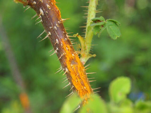 Rost befällt nicht nur die Blätter, sondern auch die Triebe der Hagebutten.