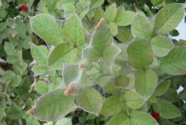 - Spinnmilbe - das Insekt verwickelt Triebe und Blätter mit einem dünnen Spinnennetz, ernährt sich von Pflanzensaft und trägt auch unheilbare Viruserkrankungen.