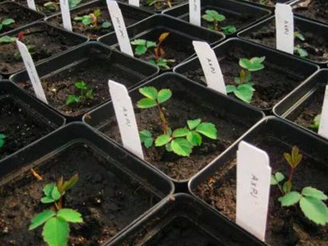 Nach dem Erscheinen eines Paares echter Blätter tauchen die Hagebuttensämlinge in getrennten Behältern