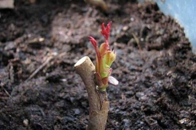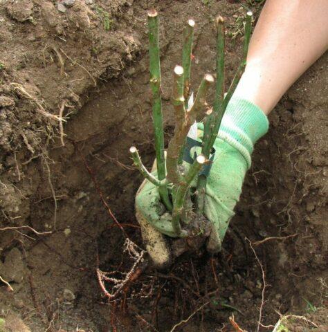 - Bei Sämlingen wird der unterirdische Teil auf 15 bis 20 cm abgeschnitten und für kurze Zeit in einer Tonlösung mit einem zusätzlichen Wachstumsstimulans eingeweicht. Danach werden die Büsche in vorbereitete Gruben abgesenkt, die zur Hälfte mit Erde bedeckt sind. Wurzelkragen sind bis zu 6 cm eingegraben.