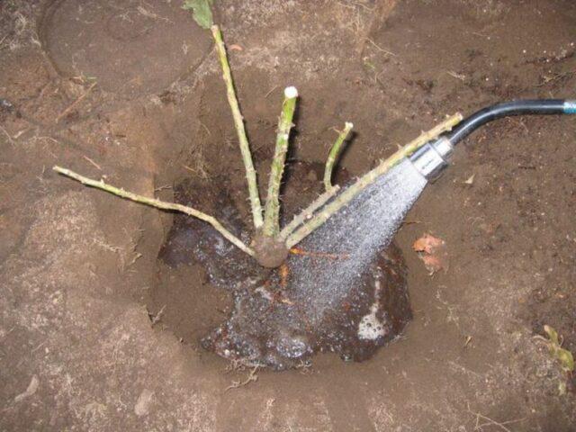Für die Sommerpflanzung kann die Hunderose zusätzlich bewässert werden, noch bevor die Grube mit Erde bedeckt ist.