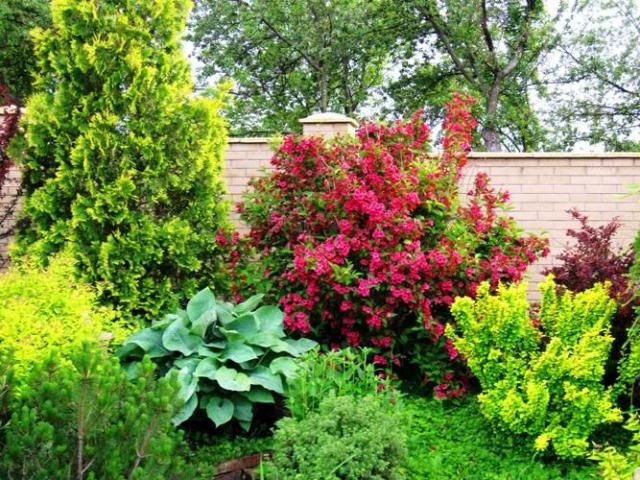 Reichlich blühende Weigela sieht in Einzelpflanzungen gut aus, kann aber erfolgreich mit anderen wunderschön blühenden Sträuchern oder Blumen kombiniert werden. Pflanzen in solchen Zusammensetzungen sollten unter Berücksichtigung des Zeitpunkts und der Dauer der Blüte, der Größe, der Wachstumsbedingungen und der Pflegeeigenschaften ausgewählt werden. Weigela sieht auch in der Zeit zwischen der Blüte malerisch aus, sodass andere blühende Pflanzen vor dem Hintergrund ihres Laubes gut aussehen. Weigela sieht in Einzelbepflanzungen vor dem Hintergrund großer Bäume oder auf Rasenflächen malerisch aus. Die Kombination von Weigela mit Nadelbäumen sieht sehr beeindruckend aus, zum Beispiel mit Wacholder, Zypresse oder Lärche. Kombinieren Sie es mit Berberitze, Rhododendron, Eibe, Flieder, verschiedenen krautigen Pflanzen. In Hecken wird Weigelu mit einer Scheinorange, Colquicia, Deytsiya, Bohne ergänzt.Sie können es unter hohen Bäumen pflanzen - diese Technik wird häufig von Landschaftsarchitekten verwendet, um mehrstufige Kompositionen aus Pflanzen unterschiedlicher Höhe zu erstellen. Es ist zu beachten, dass eine übermäßige Schattierung die Blüte der Weigela beeinträchtigt.