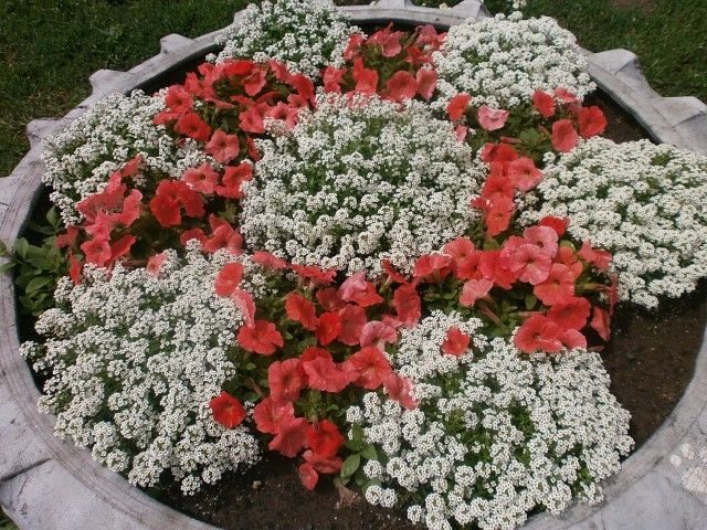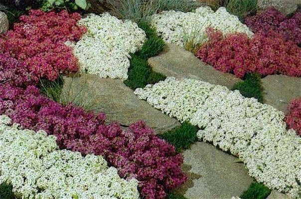 Damit das Alissum einen Blumenteppich bildet, werden Blumen in einem Abstand von 20 cm gepflanzt