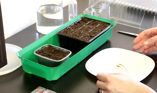 - Befeuchten und verteilen Sie kleine Samen auf der obersten Schicht und zerdrücken Sie sie leicht mit Erde.