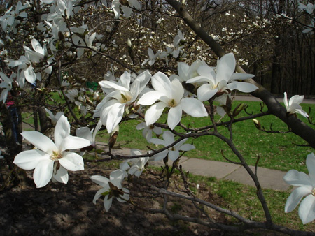 Magnolia Kobus blüht in der Region Moskau Mitte des Frühlings, das Laub ist noch nicht vollständig erblüht und die Blüte dauert etwa zwei Wochen. Dies ist normalerweise Ende April.