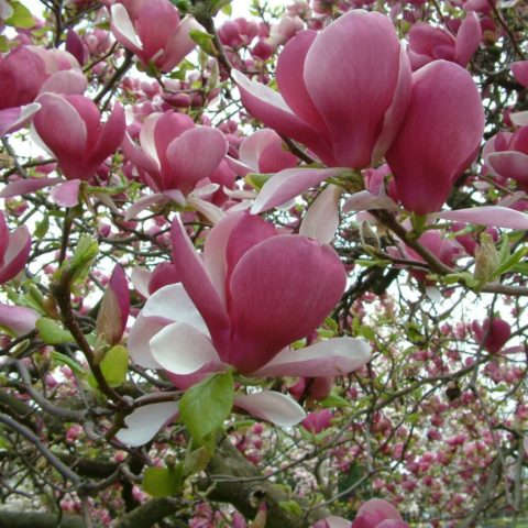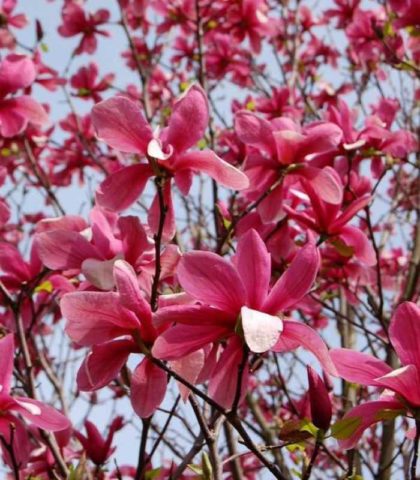 Eine Magnoliensorte Sulange Rustica Rubra ist ein Baum oder Strauch mit einer breiten Krone, die eine Höhe von 7 m erreicht. Fühlt sich in warmen, sonnigen Gebieten gut an und bevorzugt feuchte, fruchtbare Böden. Die Sorte blüht mit großen, abgerundeten Blüten. Außen ist die Krone rot-rosa lackiert, innen - in zartem Weiß und Pink. Die Blüte beginnt in der zweiten Frühlingshälfte, wenn die Zweige noch nicht mit Laub bedeckt sind.