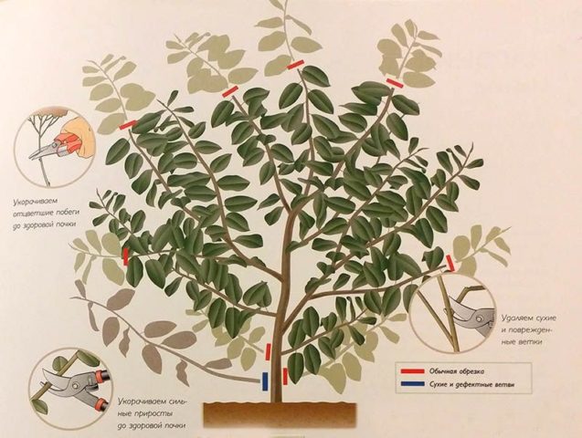Die Kultur wächst in Form eines Strauchs oder eines kurzen Baumes. Seine Höhe überschreitet 8 m nicht. Die Krone ist üppig, breitet sich aus und kann einen Durchmesser von 7-8 m erreichen.
