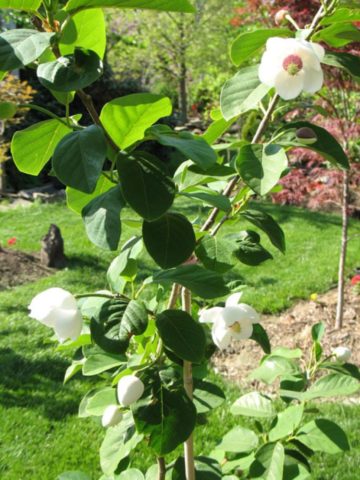 Sobald die Blätter Mitte Mai blühen, blüht der Strauch sofort. Diese Periode ist kurz: Bis Juni wird Siebolds Magnolie blühen. Kann im August mehrere Knospen freisetzen.
