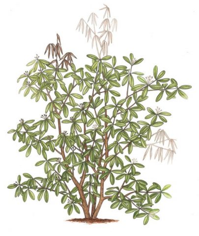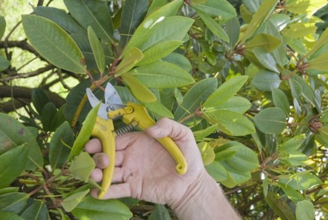 Bei immergrünen großblättrigen Arten werden stark verlängerte und kahle Triebe normalerweise im zeitigen Frühjahr gekürzt, um die seitliche Verzweigung zu stimulieren. Der verjüngende Schnitt in großblättrigen Rhododendren wird nicht häufiger als nach 12-16 Jahren durchgeführt.
