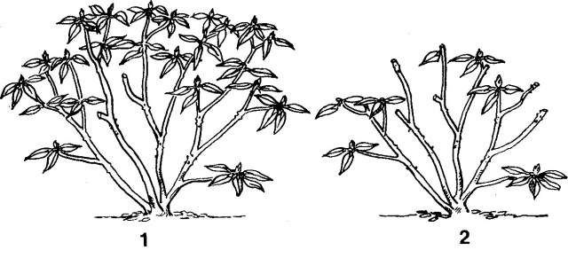 Es kommt vor, dass es notwendig ist, eine starke Verjüngung durchzuführen, wobei die Zweige fast bis zu einem Stumpf abgeschnitten werden. In dieser Version werden die Zweige in einem Abstand von 30-40 cm vom Boden geschnitten. Sie sollten jedoch nicht den gesamten Busch auf einmal abschneiden. Laubbaumarten können einen solchen Schnitt überleben, aber immergrüne Pflanzen überleben möglicherweise nicht und erholen sich nicht. Daher schneiden sie normalerweise etwa die Hälfte des Busches, um das zu vervollständigen, was sie im nächsten Jahr begonnen haben.