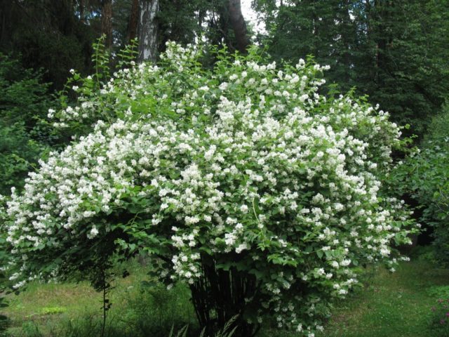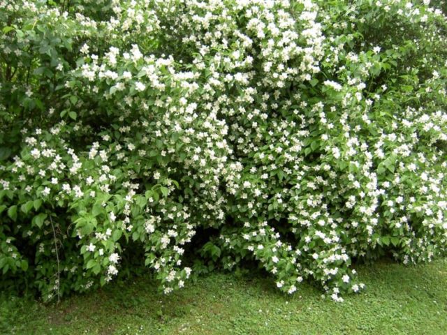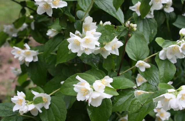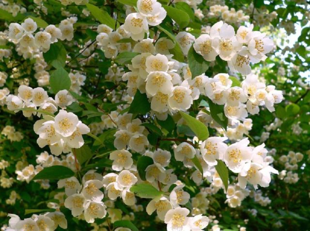 - Etwas früher beginnt die dünnblättrige Chubushnik-Sorte zu blühen Shrenk. Der Typ unterscheidet sich in einer langen Duftperiode.