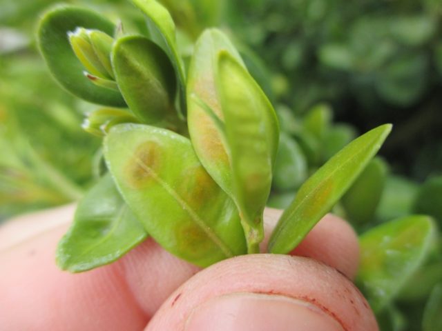 Wenn die Blätter mit gelben Flecken bedeckt sind und später ihre Farbe verlieren und trocken sind, sollten Sie das Buchsbaumholz auf kleine Milben auf der Unterseite der Blattplatten überprüfen.Schädlinge treten bei heißem Wetter mit geringer Luftfeuchtigkeit auf und ernähren sich von Saft aus lebenden Blättern.
