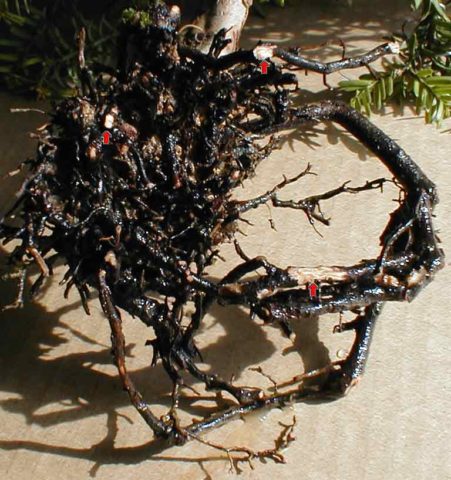 Die Infektion wird auch durch einen im Boden vorhandenen Pilz verursacht. Die Krankheit entwickelt sich aktiv mit übermäßigem Gießen mit stehender Feuchtigkeit, hauptsächlich in der kalten Jahreszeit. Wurzelkrankheit manifestiert sich in einer allgemeinen Hemmung des Wachstums und der Trägheit des Buchsbaums. Mit fortschreitender Wurzelfäule färben sich die Blätter einzelner Triebe gelb und dann die gesamte Pflanze.