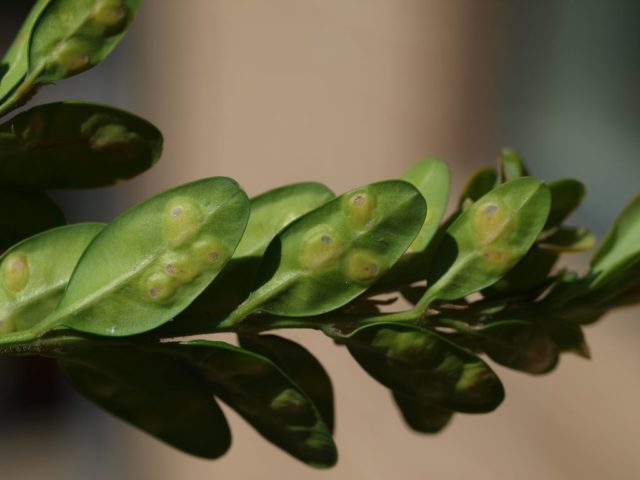 Der Schädlingsbefall tritt zunächst als gelbe Schwellung auf der Blattoberfläche auf. Auf der Rückseite der Platte bilden sich Tuberkel, in denen sich wurmartige Orangenlarven entwickeln. Junge Gallmücken ernähren sich von Buchsbaumblättern und gehen im Winter tief in den Wald, um im Frühjahr an die Oberfläche zu kommen und den Brutzyklus im Stadium erwachsener Insekten zu wiederholen.
