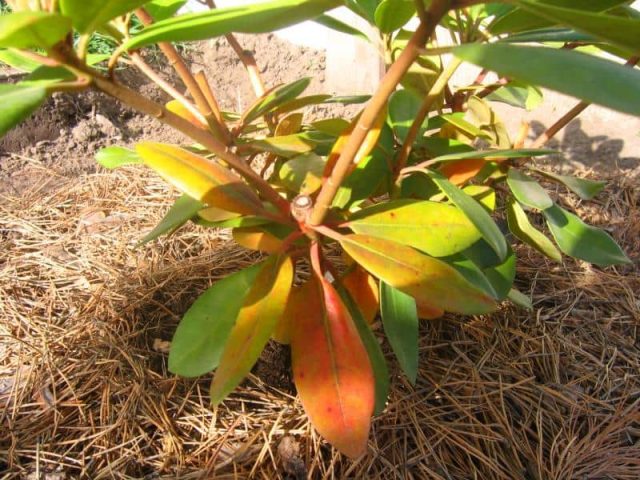 Rhododendren, die abwechselnd mit Lösungen von Ammoniumsulfat mit Kaliumnitrat oder Harnstoff und Kaliummagnesium gefüttert werden, erhalten genügend Säure. Gleiches gilt für Büsche, deren Boden mit ständig erneuertem Kiefernnadelmulch bedeckt ist.
