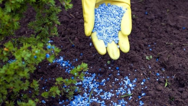 - Es ist ratsam, Mineraldünger in trockener Form gleichmäßig um die Büsche zu streuen - die konzentrierte Lösung verbrennt die Wurzeln;