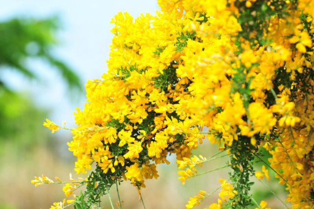 Diese hat unter anderem ein ziemlich scharfes Blütenaroma. Der Strauch blüht im Mai und bildet viele leuchtend gelbe Blüten, die sich in Rispenblütenständen sammeln.