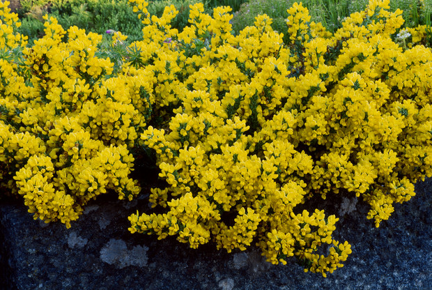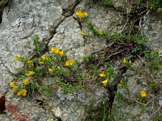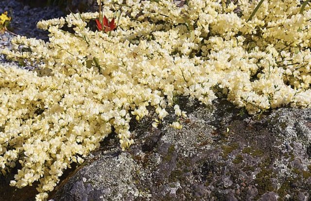 Kriechkriechpflanze (Cytisus decumbens) ist eine in Südeuropa beheimatete Pflanze. Wie der Name schon sagt, ist die Höhe des Strauchs gering - nur 20-25 cm. Die Triebe dieser Art sind grün, kurz weichhaarig und fühlen sich gerippt an. Die Farbe der Blätter ist dunkel. Die Blattplatte ist lanzettlich und an der Unterseite mit Zotten bedeckt. In den Achseln der Blätter befinden sich panikartige Blütenstände, die aus vielen kleinen Blüten bestehen. Ihre Blütenblätter sind sattgelb, manchmal finden sich Sorten mit dunklen Blüten.