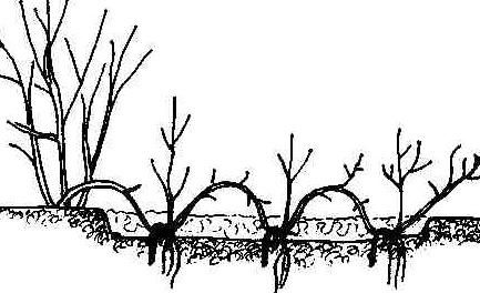 - Im Frühjahr wird ein jährlicher Spross am Busch am Boden der Pflanze ausgewählt und sanft zum Boden geneigt.