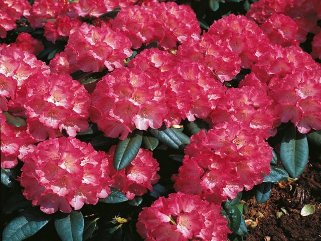 Die Knospen der Pflanze sind scharlachrot, nach dem Öffnen leuchten sie auf. Fantastische Rhododendronblüten - in Form von Glocken, bunt in Rosatönen, 7 cm Durchmesser. Die Blütenblätter sind gewellt und haben einen leuchtend rosa Rand. Punktmuster sind auf allen Blütenblättern sichtbar. Die Glocken werden in kugelförmigen Blütenständen mit jeweils 10 - 12 Blüten gesammelt. Es gibt kein Aroma.