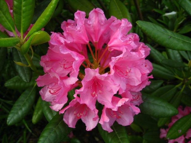 Rhododendronblätter sind dunkelgrün, einfach, wechselständig. Die Länge der Blattplatte beträgt 7,5 cm, die Breite 5 cm. Der Blattstiel ist bis zu 5 cm groß. Die Haager Sorte produziert rosa Blüten, die in Blütenständen von 8 bis 12 Stück gesammelt werden. Auf der Innenseite der Blütenblätter befinden sich rötliche Flecken. Die Länge der Blüten beträgt bis zu 6 cm, die Breite bis zu 1,5 cm. Nach der Blüte im Herbst reifen hellgrüne Früchte mit einer Länge von 2 - 4 cm.