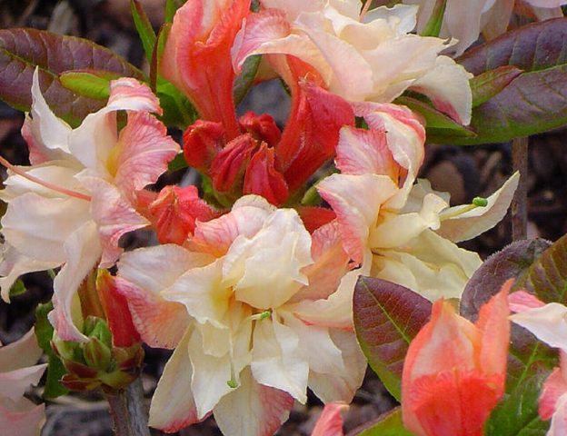 Laubwechselnde Rhododendren sind eine üppige Pflanzenart. Sie unterscheiden sich in der unterschiedlichen Konfiguration von Blechplatten, deren Dekorativität auf jeden Fall sehr attraktiv ist. Der zweite Vorteil von Heidekraut sind die wunderschönen Blüten in verschiedenen Farben, ähnlich wie bei Blumensträußen. Rhododendron Cannons Double unterscheidet sich von anderen Sorten im Farbbereich der Blütenstände.