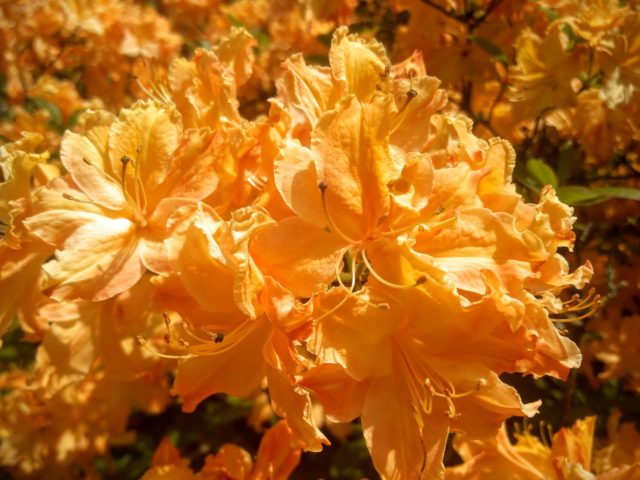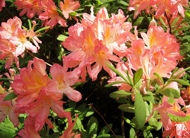 japanisch - unprätentiöser, hochdekorativer Strauch. Bildet einen dichten, verzweigten Busch mit einer Höhe von bis zu 1,8 m. Der japanische Rhododendron gehört zu Laubsträuchern. Ab dem Ende des Frühlings blüht es einen Monat lang, gleichzeitig blühen die Blätter im Busch. Die Blüten haben ein angenehmes Aroma. Sie werden groß - etwa 8 cm im Durchmesser, 7-10 Stücke werden im Blütenstand gesammelt. Sie sind in verschiedenen Farben Orange, Rot und Beige-Gelb erhältlich. Die Blüte beginnt nach 3-4 Jahren Kultivierung.