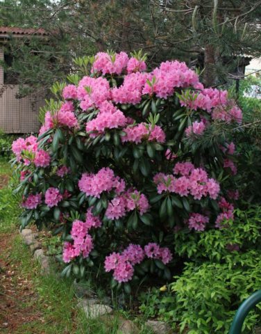 Roseum Eleganz Ist ein immergrüner Strauch in England entwickelt. Der Busch wächst bis zu 3 m hoch und 3,5 m breit und bildet eine abgerundete Kronenform. Die Blätter sind ledrig, glänzend und haben die Form eines länglichen Ovals mittlerer Größe. Junge Blätter haben beim Blühen eine rotbraune Tönung, die sich beim Wachsen in Grün verwandelt. Die Blüten sind tiefrosa mit einem rotbraunen Fleck. Die Form der Blume ist breit trichterförmig mit einer Welle entlang der Kante. Blütenstände sind kompakt, kombinieren 15 Blüten. Die Blüte beginnt Anfang Juni. Es gibt kein Aroma. Widersteht Frost bis -32 ° C.
