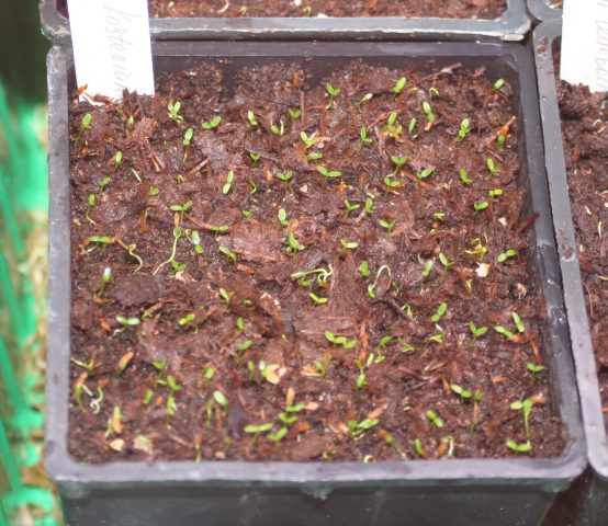 Im Winter Rhododendren säen. Der Torfmischung wird grober Flusssand mit einer Geschwindigkeit von 3: 1 zugesetzt. Die Aussaatbehälter werden flach (5-6 cm) mit Drainagelöchern gewählt. Der Boden wird angefeuchtet, leicht verdichtet und die Samen werden in einem Abstand von 1,5-2 cm voneinander auf der Oberfläche verteilt. Dann werden die Behälter mit Glas bedeckt und im Licht gekeimt. Pflanzen brauchen tägliche Belüftung, Bodenfeuchtigkeit. Die ersten Triebe erscheinen in einem Monat.