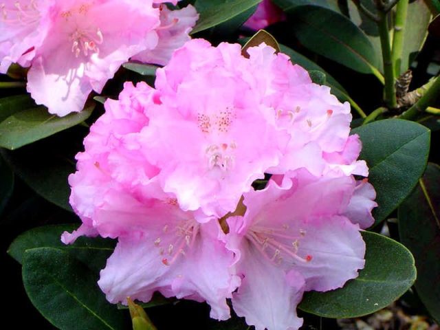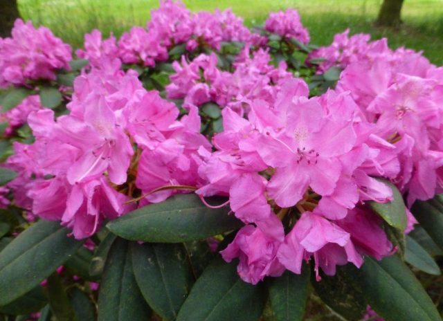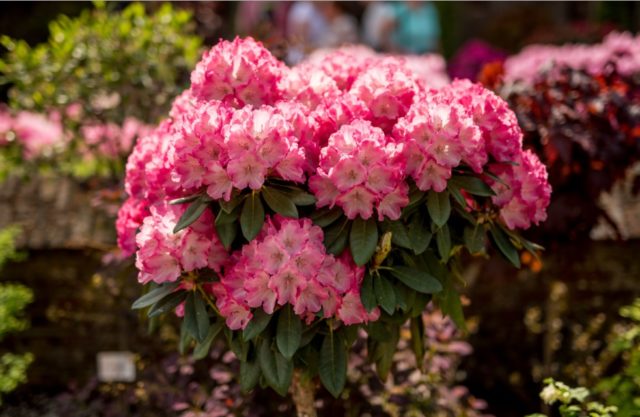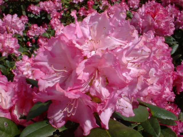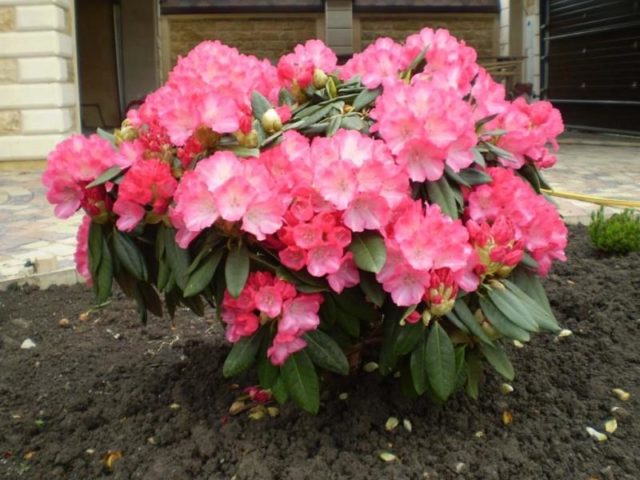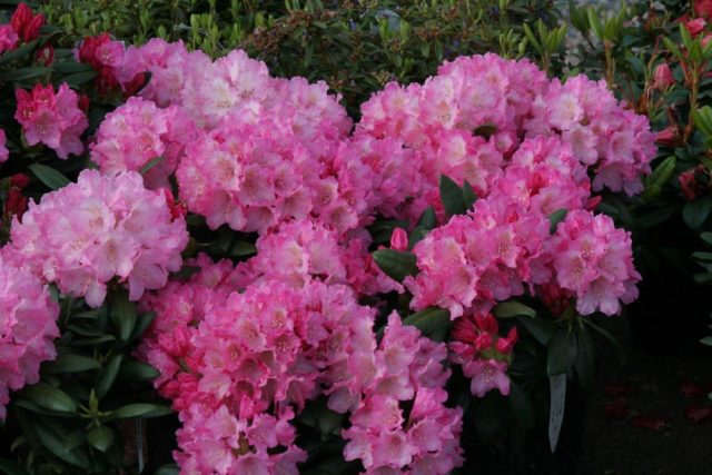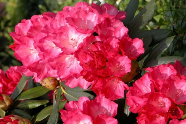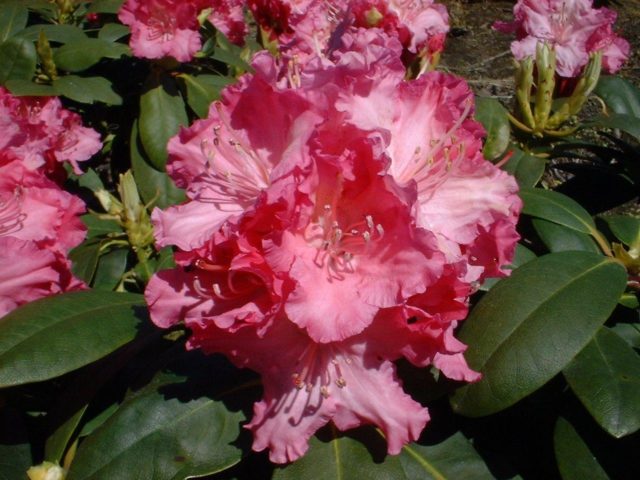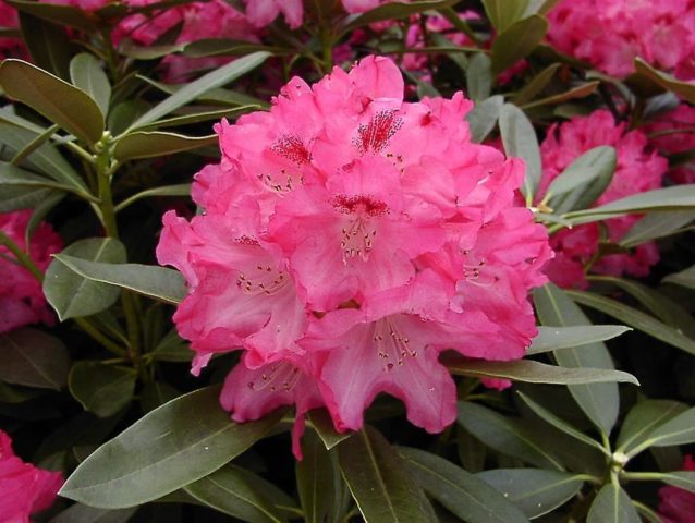 Mischsorte ist ein immergrüner Strauch. Eine Pflanze mit länglichen dunkelgrünen Blättern. Der Busch wächst bis zu einer Höhe von 2,2 m. Die Blütenstände sind groß und bestehen aus 6 - 8 Blüten. Die Blütenblätter sind dunkelrosa, in der Mitte heller. Die Blüte findet von Mai bis Juni statt.