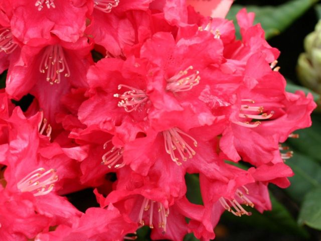 Von Mai bis Juni bringt der Strauch leuchtend rote Blüten hervor. Sie sind in Blütenständen von 10 - 12 Stück gebildet. Die Blüte beginnt Anfang Mai und endet am Ende des Monats. Die Ränder der Blütenblätter sind wellig, in der Mitte ist ihre Farbe heller. Die Blütenstände sind groß und mehr als 10 cm groß. Die Blätter der Pflanze sind grün, länglich und an den Rändern leicht verdreht.