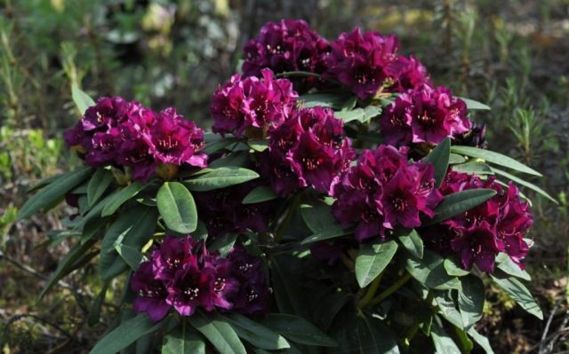 - Polarnacht (Pollarnacht, Polarnacht) zeichnet sich durch schnelles Wachstum und Langlebigkeit aus. An einer Stelle wächst der Rhododendronbusch gut und blüht bis zu 100 Jahre. Die Pflanze ist kräftig, wird bis zu 2 m hoch, die Krone hat die gleiche Größe. Die Dekorativität ist sehr hoch, die violette Farbe der Blüten verleiht der Pflanze eine ungewöhnliche Natur. Neben der saftigen Farbe haben die Blüten spektakuläre gewellte Blütenblätter, deren Farbe sich mit dem Beleuchtungsgrad ändert. Im Licht bekommen sie einen purpurroten Farbton, im Schatten werden sie fast schwarz. Im Blütenstand gibt es bis zu 20 Stück, jede Kugel ähnelt einem Strauß. Die Höhe eines erwachsenen Rhododendrons beträgt etwa 1,4 m. Er beginnt Ende Mai in der Region Leningrad zu blühen und hält Temperaturen von bis zu -26 ° C stand.