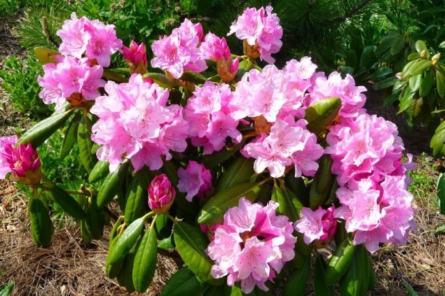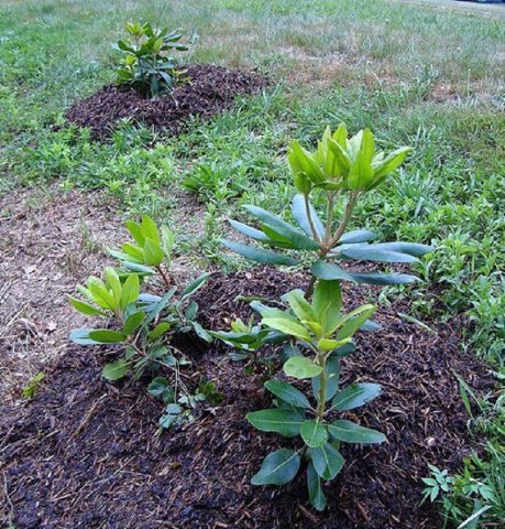 Darüber hinaus müssen die Büsche mit einer Schicht von 3 cm mit Kiefern- oder Fichtenrinde gemulcht werden. Eine Lockerung der Rhododendren ist jedoch aufgrund der Nähe der Wurzeln zur Bodenoberfläche kontraindiziert.