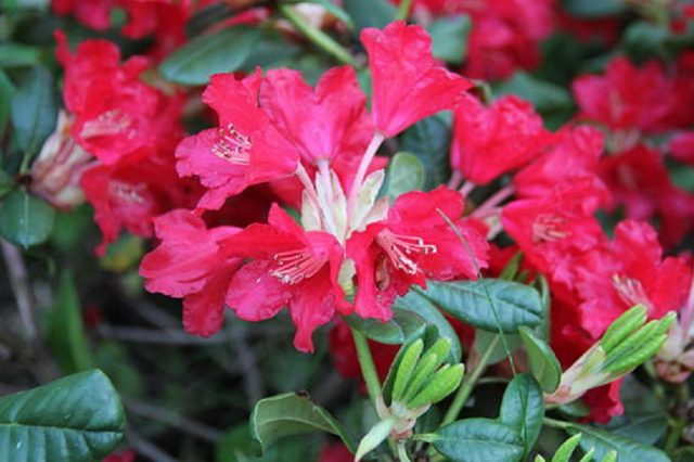 - Nova Zembla Ist eine rotblumige, immergrüne Rhododendron-Sorte. Genau wie die vorherigen Rhododendronarten beginnt sie ab Juni zu blühen. Die Blüten sind hell, rubinrot und haben schwarze Flecken im Blütenblatt. Sphärische Blütenstände von 13-17 Originalblüten. Die Blüten riechen nicht, die Blätter des Strauchs sind dunkelgrün, glänzend und wie eine Ellipse geformt. Wenn das Alter von 10 Jahren erreicht ist, hat der Rhododendron eine Buschhöhe von 1,6 bis 1,8 m und eine Kronenbreite von 1,6 m.Die maximale Höhe, die für die Sorte festgelegt ist, beträgt 2,5 m. Die Winterhärte ist hoch und hält Temperaturen bis zu -32 ° C stand.