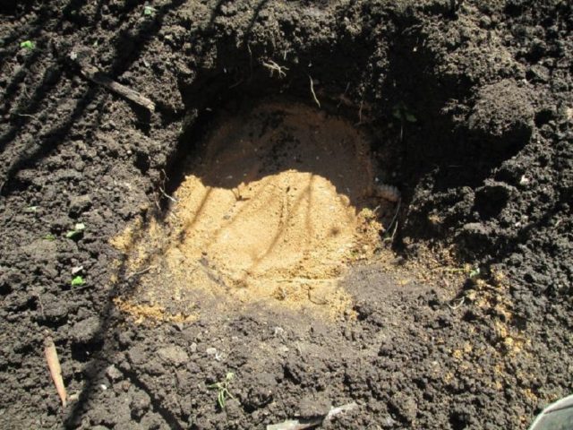Nach der Vorbereitung der Grube und dem Verlegen der Bodenmischung muss der Boden gut bewässert sein. Wenn die Pflanze in einem Pflanzgefäß gekauft wird, wird sie einfach mit einem Erdklumpen in das Loch überführt. Der freie Raum wird mit dem restlichen Boden gefüllt und erneut bewässert. Von oben muss die Peri-Stem-Zone mit einer Schicht von 5 cm gemulcht werden.