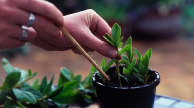Das Material wird im Juli geerntet, die Blätter müssen oben auf dem Schnitt belassen werden. Das untere Ende des Schnitts wird in eine Heteroauxin-Lösung getaucht und dann in eine Bodenmischung gegeben. Der untere Teil des Behälters, in dem die Wurzelbildung stattfindet, muss mit warmer Luft erwärmt werden. Dazu werden die Container vom Boden abgehoben. Rhododendren wurzeln langsam. Eine Transplantation ist erst nach einem Jahr verfügbar. Wenn die Stecklinge sofort in den Boden gelegt werden, werden sie im ersten Winter zuverlässig abgedeckt. Während der Wachstumsphase produzieren die Stecklinge 3 Prisen.
