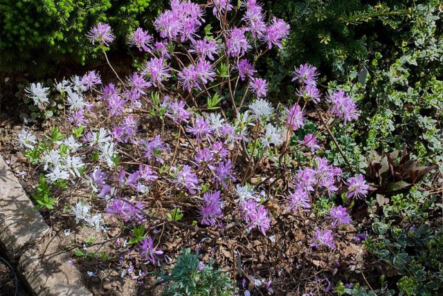Schlippenbachs Rhododendron gilt als Laubbaumsorte, die in ihrem natürlichen Lebensraum bis zu 4 m wächst. In der Region Moskau wächst dieser Strauch viel langsamer, die Höhe der erwachsenen Exemplare beträgt 1,5 - 2 m. Dies hat jedoch keinerlei Einfluss auf die Blüte der Sorte. Es ist reichlich vorhanden und beginnt oft noch bevor Laub auf der Pflanze erscheint. Die Blüten dieses Rhododendrons haben eine hellviolette Farbe und ein angenehmes Aroma. Außerdem haben sie lange, leicht gebogene Staubblätter von bis zu 10 Stück. Die grünen Blattplatten des Strauchs sind klein und glatt, im Herbst sind sie in Rot-, Orangen- und Gelbtönen gestrichen.
